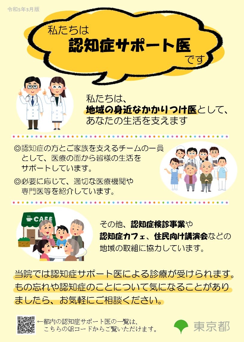 • 東京都では、上記の通り、区市町村や認知症疾患医療センター等が認知症のある人・家族等の支援における相談や、研修の企画や講師としての協力依頼等を行いやすくするため、認知症サポート医の皆様のそうした相談等への対応可否について、公表させていただくこととしました。
