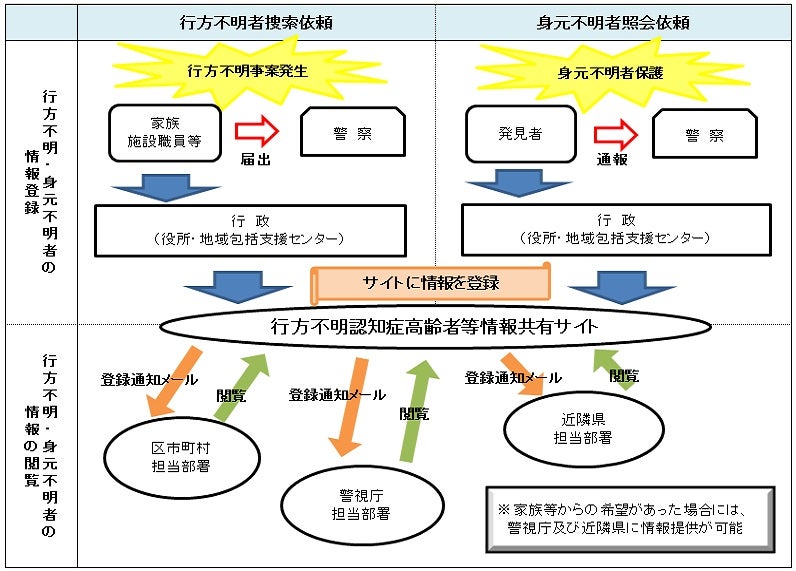 東京都では行方不明となった認知症高齢者や、身元不明で保護された認知症高齢者の情報について区市町村からの依頼に基づき、都内の他の区市町村や近隣県へ一斉に周知する取組を行っています。